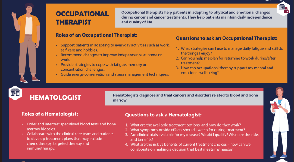 This infographic introduces healthcare professionals who may be involved in cancer care and explains how they support patients and families. Care teams vary from person to person, so not all roles will apply in every situation. To help you feel more prepared and confident, we also provide suggested questions you can ask when meeting the healthcare providers shown below.