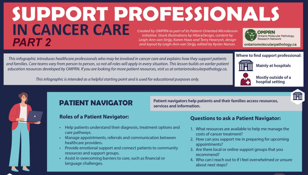 This lesson builds on the original ‘support professionals in cancer care’ infographic available here, as well as on earlier patient education resources developed by OMPRN, available here.